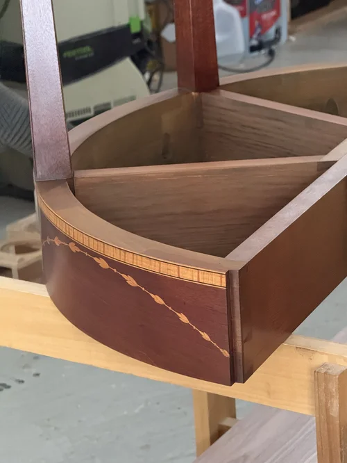 Materials: White oak, figured maple, white pine, ebony, brass, mica.