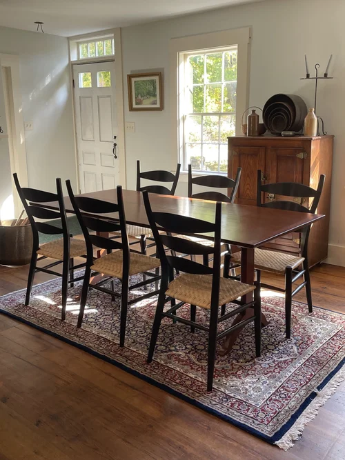 Completed in 2024, this set includes a traditional Shaker trestle table and six ladder back chairs with binder cane that I wove in a 3/3 herringbone pattern.